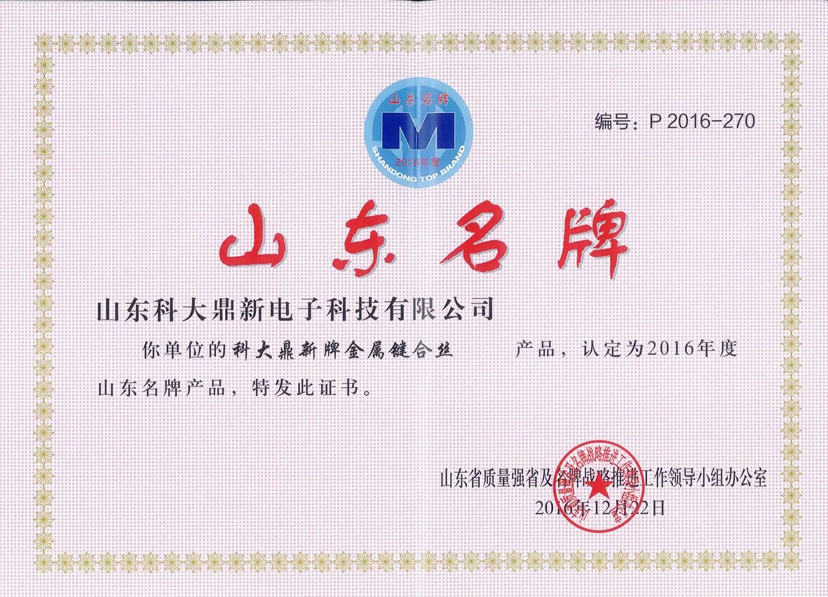 我公司“科大鼎新牌金屬鍵合絲”成功榮獲《山東名牌》榮誉